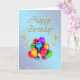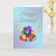 Fun colourful balloons, gold stars and a blue background with a gold text "Happy Birthday"