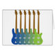 A colourful display of bass guitars, with variegated shades running from blue to green.