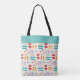 Colourful and modern beach holiday icon pattern on personalised holiday tote bag.