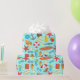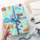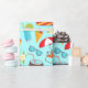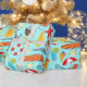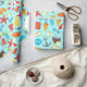Graphics of beach vacation elements on a bright blue background, seamless repeat pattern