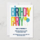 This is a fun and colourful birthday party invitation perfect for children. The party invitation reads: Birthday Party in big bright letters and it features two colourful balloons.