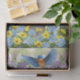 Bluebirds and goldfinches enjoying a fountain birdbath in a colourful spring flower garden of purple clematis clinging to a white picket fence, and yellow and blue daisies below. Artwork by wildlife and equine artist Crista S. Forest.