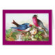 One bird stands on a bamboo waterspout and the other among the apricot roses in this Victorian trade card from the 19th century.