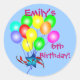 A bright, fun balloon bouquet flies through the air tied together with a blue shining star and red ribbon. Personalise these colourful stickers with any name and birthday age. Shown is "Emily's 6th Birthday!" on a light blue background. Easily change all the text and even change the colour as well as the blue background. Just click on customise and then click on "colours" to change it.