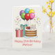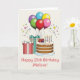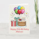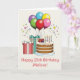 Destei's original birthday theme illustration featuring colourful birthday balloons together with two present boxes and a birthday cake. The brown and cream colour cake has several layers on it and the top is decorated with four colourful candles, two strawberries and some blueberries. The gift boxes are wrapped with beautiful bows and there is some confetti on the sides of the design. The colour scheme includes colours such as red, pink, blue, yellow, purple, teal, and beige. There is also a personalizable text area.