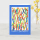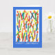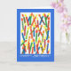 An eye-catcing birthday card, with brightly coloured candles on a white background with a bright blue border, from a handpainted paper collage by Judy Adamson. Please feel free to personalise the inside message.