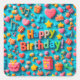 Bright and cheerful arrangement of birthday elements including gifts, hearts, stars, and musical notes on a vibrant blue background, perfect for festive and celebratory themes.