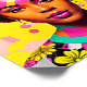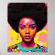 This pop art style artwork features a beautiful black woman with a large afro, 70s aesthetic with some flower power and hoop earrings. A vibrant melanin beauty with natural hair in a bold, multicolor digital art piece. Cyan, magenta pink, and yellow colour scheme with some peach.