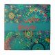 Colourful boho ceramic tile. The background is a teal blue bohemian style pattern with lots of bright colours. Personalise this tile with your name to make it your own.