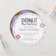 Theme Parties' "Doughnut Miss This Party" is the colourful first impression your doughnut-themed party need! The design features doughnuts {or doughnuts, if you prefer} with blue, white, and pink icing and colourful sprinkles {because what's a doughnut without sprinkles?!}. And the round invitation design is the perfect shape for a doughnut party! The reverse side is a giant doughnut -- cut out the centre RSVP information, and hang extras as party decorations. #BoysParty #DonutMissThisParty #Doughnut #Doughnut