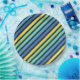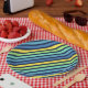 Paper plates featuring a colourful blue green and yellow stripes pattern. These plates are great for any celebrations.