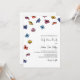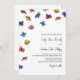Colourful floral wedding invitations with drifting flowers in yellow, blue, violet, and orange against a white background. Floral summer wedding invitation in strong colours.