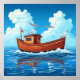 Illustrative artwork of a wooden boat sailing on calm waters with seagulls flying and perched nearby, evoking serenity and maritime themes.