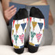 These cute Holiday themed socks have a repeating pattern of boho style Christmas trees in various colours and patterns. The images are placed on a white background. Festive, bright, and colourful!