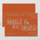 This Design Features an almost Deep Burnt Orange coloured Background and a soft Teal Text. The text combination is a mix of bold and calligraphy. Perhaps the best part about this Invitation is that is comes in multiple colours, so you can mix and match different invitation colours with your other wedding stationary, but everything is designed to be cohesive, no matter what colour you pick. We wanted something fun and going "full colour wheel" seemed to be the ticket. We home you enjoy this invitation and the coordinating items available in our store.