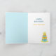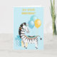 This cute kids birthday card works equally well for a girl or a boy, and features an adorable striped zebra with a boho style blanket on his back. Floating behind him are gold and blue birthday balloons, with polka dot and striped gifts sitting beside him. The text, in orange at the top, says "It's Your Birthday!" The images and text are placed on a pale blue background. There are two custom text fields inside, plus an image of a birthday cake.
