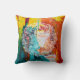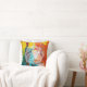 A white petal mandala is overlaid on a yellow, orange, and turquoise blue abstract painting. Add style and colour to any room with this bold pillow.