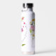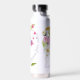 A delicate bouquet of colourful spring flowers is featured on the front and back of this water bottle. The text reads, "happiness blooms from within "