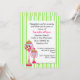 Stylish invitation for a candy buffet bridal shower theme. Graphics of whimsical pink and green standing bubble gum machine, candy dish and gaily wrapped candy decorate the left bottom corner of the green and white striped invitation. Text in black and pink, on a decorative scalloped edge white text area, is ready to personalise for your bride's special day.
