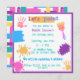 Fun and colourful square invitations for an epic painting theme birthday party with vibrant colours of pink, blue, purple, orange, and turquoise in paint strokes and paint splats with painted hand prints and a paint brush. Edit text to customise for your event.