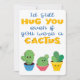 This colourful greeting card features three fun cartoon cactus on a white background. The caption, in calligraphy blue and all caps yellow fonts, reads I'd still hug you even if you were a cactus.