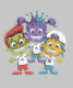 A vibrant and stylised cartoon illustration of three happy kids with exaggerated features and bright, unconventional skin tones. One child wears a crown, another has glasses, and the third wears a backward cap. Their joyful expressions and playful poses make this image energetic and fun.