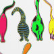 A colourful pattern, of six cats showing off their cute butts. Done in the 1960s pop art style.