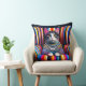 Cat with colourful stripes sitting in a chair with colourful stripes.