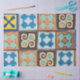 Hand painted traditional Mediterranean tiles design. Patterns of perfection. Geometric patterns in blue, orange, brown and yellow tones. The perfect decorative design that makes for an ideal Christmas present, birthday gift, nursery decor, kids room art, home decor or for any occasion. Modern contemporary art design.