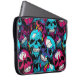 colourful and chaotic pattern of skulls. The skulls are mostly blue with various shades of pink and purple splatters and drips. Some of the skulls have cracked teeth and broken bones, adding to the gruesome and macabre nature of the image. The background is black, which helps to highlight the skulls and make the colours pop.