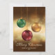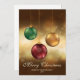 Destei's original illustration of different colour Christmas baubles on a beautiful bokeh background. There are green, red and golden yellow colour Christmas baubles in the design. There are also two personalizable text areas.