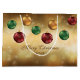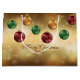 Destei's original illustration of different colour Christmas baubles on a beautiful bokeh background. There are green, red and golden yellow colour Christmas baubles in the design. There are also two personalizable text areas.