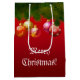 Share your Christmas joy with a loved one along with this customised gift bag richly decorated with shiny holiday ornaments and green douglas fir on a red background!