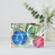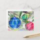traditional watercolor artwork of a colourful ensemble of christmas tree ornaments in green, blue and red colours on a postcard.