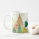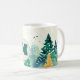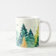 This image shows beautiful water colour painting of a forest with colourful trees showing different colours representing various trees such as pine, pruce and fir in varying heights of the trees giving holiday atmosphere making it suitable to decorating festive gifts.