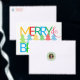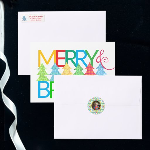 Uniquely colourful group of evergreen trees in wonderful holiday shades. Each tree has a mosaic texture created from a hand painted watercolor design that SW Designs are known for. Colourful script adds a cheery holiday greeting.