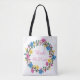 Pretty, colourful pink, blue, and yellow flowers arranged in a circle wreathe design, with a placeholder for Bride or Name, and wedding date, are printed on custom tote bags. The text is easy to personalise on the template form. The floral design is tiled in a smaller pattern on the back of the bag. There are matching items in this store. Thank you for shopping at CherylsArt on Zazzle.