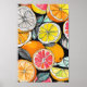 Bring home the zest of life with this colourful citrus poster. This vibrant piece of art is a celebration of colour, nature, and the simple joy that comes from a slice of citrus. It features a unique ink illustration of lemons, oranges, and grapefruits, each sliced open to reveal their vibrant insides against a striking black background.