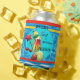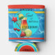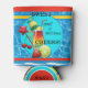 Can cooler featuring a colourful design with a cocktail and fruits on a striped background with pool image.
