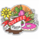 Colourful Tattoo-style design with Coffee, Doughnut, flowers, and a red banner that reads coffee. On the mug is the word please.