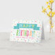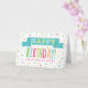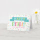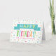 Birthday card for friend with colourful confetti, hand lettered style retro text and vintage banner in bright blue, orange, yellow, green and hot pink.