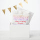 This generic birthday party paper favour bag features colourful top and bottom confetti borders with a peachy orange birthday template text. This design text can be personalised for any special occasion. Personalise the text in the template fields or edit using the design tool to select a font style, size, and colour you prefer.