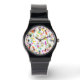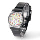 A fun colourful watch face adorned with a festive party atmosphere colourful confetti toss over white.  The black numbers are a template which you can remove/clear. Pick your watchband "Style" and "Colour" under Options.