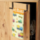 A cute and colourful construction vehicles theme pattern kitchen towel for the boys. The pattern is make up of lots of construction elements like a red and yellow dump truck carrying the debris, an orange excavator, a green front loader pushing dirt, a blue and yellow concrete mixer, orange and white cones and a yellow and black construction zone barrier. Personalise child's name within space available. Perfect for boys who love construction vehicles, toys and machines!