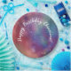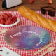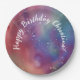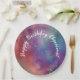 Cosmically cool paper party plates feature a colourful watercolor celestial background with customisable white curved text overlay.  Perfect for birthday parties and other special events throughout the year..