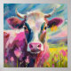 A whimsical modern impressionist painting of a cow, rendered in bright, vibrant colours like pink, green, and teal. Thick abstract brushstrokes bring texture and movement to the composition, giving the cow a playful and energetic appearance. The bold colour choices and expressive strokes make this a fun, contemporary take on traditional animal portraiture, perfect for adding a cheerful touch to any space.