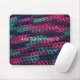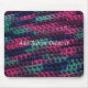 This mousepad features a crochet pattern design, a mix of rose, blues, greens and dark purple.