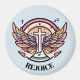 Colourful Cross Agnel Wings Rejoice, this Christian design is happy and joyful and features a Colourful Cross with Agnel Wings and text saying, "Rejoice".