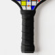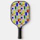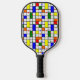 This pickleball paddle has a mid-century modern design of a grid with coloured squares and rectangles. It also has coloured circles placed on the grid lines. If you like the design but prefer different colours, message me.