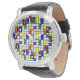 This men's watch has a mid-century modern design of a grid with coloured squares and rectangles. It also has coloured circles placed on the grid lines. If you like the design but prefer different colours, message me.